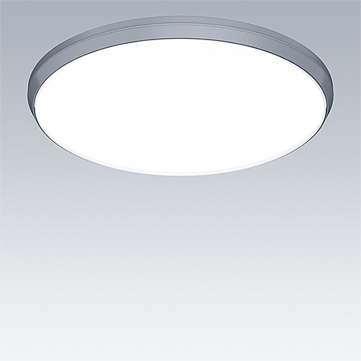 Luminaire circulaire décoratif avec corps Large. Composant indirect bas pour éclairage du mur et du plafond. Électronique, gradable DALI. Garniture esthétique du luminaire en Polycarbonate (PC) argent. Diffuseur : opale Polycarbonate (PC). Classe électrique II, IP54. Livré avec LED 4 000 K.