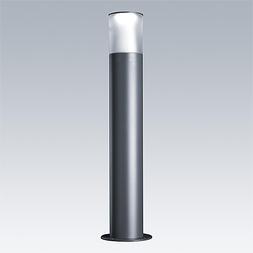 Borne LED intemporelle. Electronique, non gradable. Classe électrique II, IP65. Tête et corps : aluminium thermopoudré gris 900. Diffuseur : Polycarbonate (PC) anti-UV semi-opale. Montage sur semelle recevant 4 tiges de scellement. Équipé d'un connecteur. Livré avec LED 3 000 K