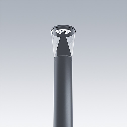 Lanterne poteau discrète avec 18, LED alimentées avec 700mA et distribution lumineuse de type Confort symétrique radial. Flux fixe Driver. Classe électrique II, IP66, IK10. Base : aluminium Moulage sous pression (EN AC-44300). Finition : aluminium thermopoudré, gris anthracite 900 sablé texturé. Diffuseur : Polycarbonate (PC) transparent stabilisé aux UV. Pré-câblé avec 3 m de câble.. Mât à commander séparément.