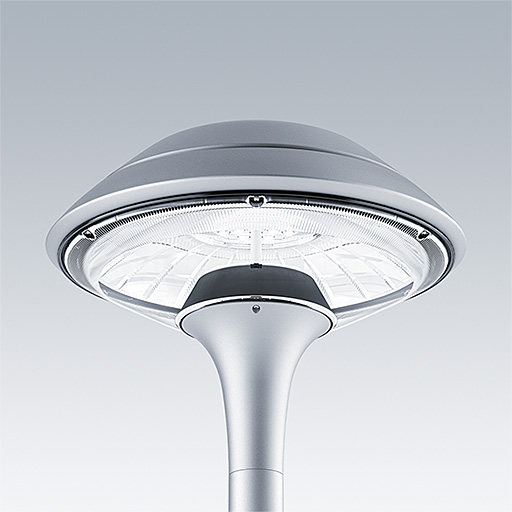 Plurio Direct : Lanterne LED décorative à montage top avec distribution Radialement symétrique. Driver avec 18 LED entraînés à 1,05A. Classe électrique II, IP66, IK08. Base : coulé aluminium, thermopoudré gris argent. Chapeau : forme plat, aluminium, texturé gris argent. Diffuseur : anti-UV, transparent Polycarbonate (PC) avec prismes anti-éblouissement. Optique à lentille direct avec réflecteur interne Equipé d'un 50% circuit de réduction de puissance, qui entre en vigueur 3 heures avant et 5 heures après un minuit calculé. Il peut être désactivé à l'installation avec un interrupteur interne facilement accessible. Livré avec LED 3 000 K. Montage top sur mât de Ø 60mm.