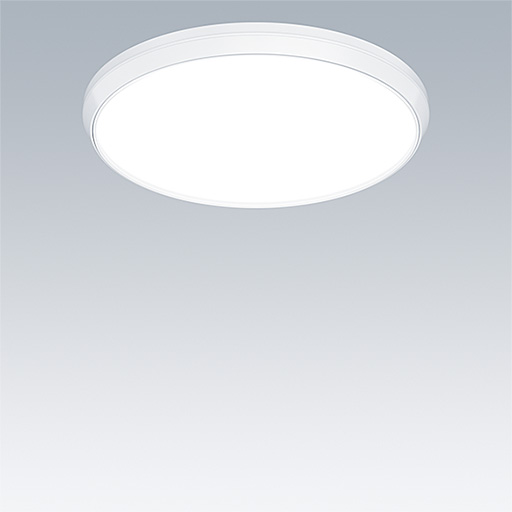 Luminaire circulaire décoratif avec corps Medium. Composant indirect bas pour éclairage du mur et du plafond. Électronique, gradable DALI. Garniture esthétique du luminaire en Polycarbonate (PC) blanc. Diffuseur : opale Polycarbonate (PC). Classe électrique II, IP54. Livré avec LED 3 000 K.