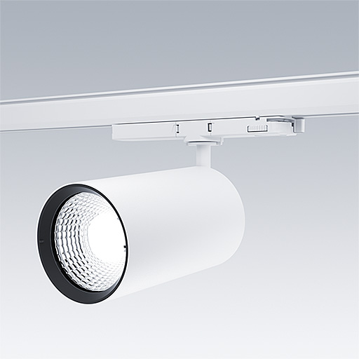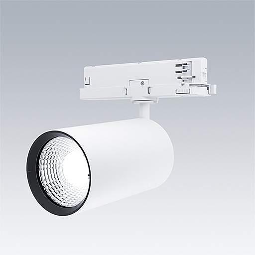 Projecteur LED pour installation sur rail triphasé avec distribution lumineuse de type projection large et température de couleur stabilisée. Electronique, non gradable. Classe électrique II, IP20. Corps : aluminium Moulage sous pression, peinture microtexturée blanc. Réflecteur : PC poudré. Projecteur orientable sur le plan horizontal de 360° et inclinable sur le plan vertical de 90°. Livré avec LED 4 000 K