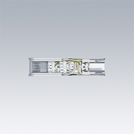 Sortie de puissance Électrique , blanc. Acier rouler-formé acier pour la connexion électrique du système de rangée continue. Bornes de connexion à brancher pour 5 câbles de secteur, 2 x 2 câbles d’éclairage de secours et 2 lignes de commande. Embouts inclus.
