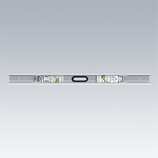 Alimentation électrique centrale L750 en blanc fabriquée de tôle d’acier rouler-formé pour un raccord électrique central ou une distribution de charge centrale de la rangée continue. 2 jeux avec bornes de raccordement enfichables pour 5 lignes d’alimentation secteur, 2 x 2 conducteurs d’éclairage de secours et 2 lignes de contrôle. Protection tactile pour la partie conductrice de courant. L’alimentation centrale Contus peut être couverte avec les extrémités des deux luminaires Contus qui ont une longueur d’au moins 1000 mm ou avec des bandes de recouvrement. L’unité d’alimentation centrale est livrée avec deux embouts de goulotte.