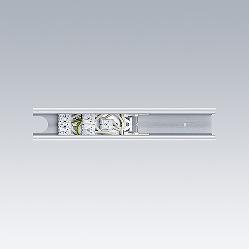Alimentation électrique, blanc, fabriqué en tôle d’acier rouler-formé ; pour le raccordement électrique du système à rangée continue. Bornes de raccordement à brancher pour 5 câbles de secteur, 2 x 2 câbles d’éclairage de secours et 2 lignes de contrôle. Embouts et couvercles de protection inclus pour empêcher tout contact accidentel avec les conducteurs électriques.