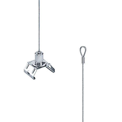 Cordon de suspension avec boucle (diamètre : 6 mm) pour connecter la goulotte, sans outils, en utilisant la technologie CLIX. Fixations en V2A acier à ressort anti-rouille. Cordon en acier galvanisé. Réglage de hauteur continu. Le cordon peut être coupé à la longueur voulue. Charge maximale : 30 kg. Dimensions de la fixation : 28 x 42 x 9 mm.