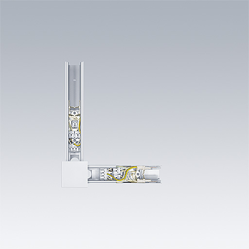 Connecteur électrique et mécanique de forme L, blanc. Avec un embout mâle et un embout femelle pour un raccord mécanique et 2 groupes de bornier pour entrée ou sortie électrique.