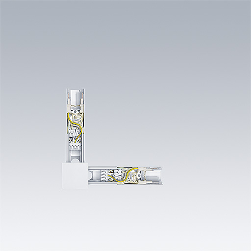 Connecteur électrique et mécanique de forme L, blanc. Avec deux embouts mâles pour un raccord mécanique et 2 groupes de bornier pour entrée ou sortie électrique.