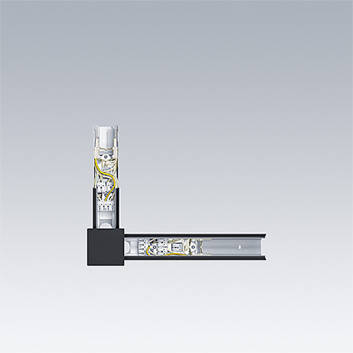 Connecteur électrique et mécanique de forme L, noir. Avec un embout mâle et un embout femelle pour un raccord mécanique et 2 groupes de bornier pour entrée ou sortie électrique.